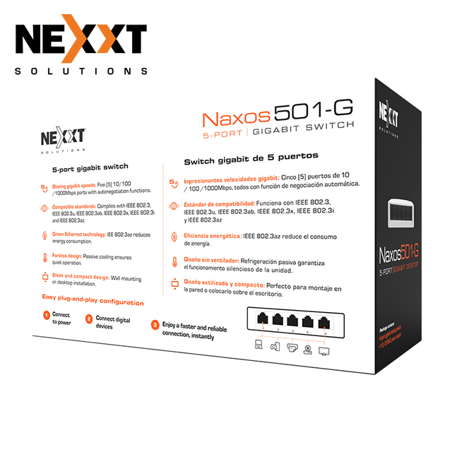 Nexxt Naxos501-G (NSW-N501G), 5 puertos RJ45, Gigabit Ethernet, tipo escritorio, no gestionado, plug and play, puertos con auto-negociación, indicadores LED. Precio no incluye IVA.