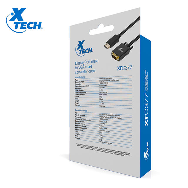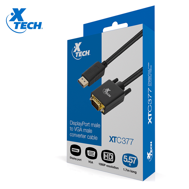 Xtech, XTC-377, cable convertidor de DisplayPort macho a VGA macho, 1080p @ 60 Hz, longitud 1.7 metros. Garantía 1 año. Precio no incluye IVA.