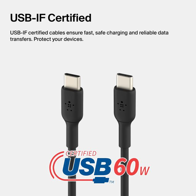 Belkin, CAB003bt1MBK, USB-C a USB-C, 60 W, material del forro PVC, longitud 1 metro. Garantía 1 año. Precio no incluye IVA.