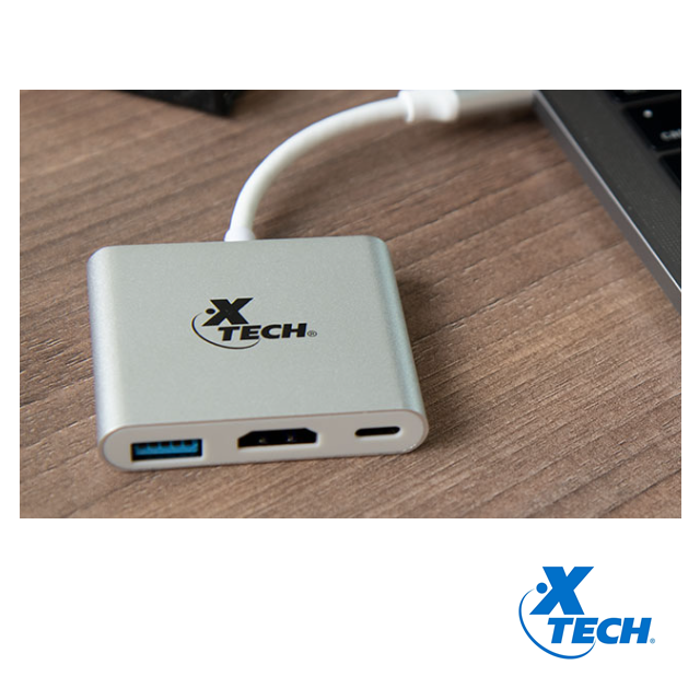 Xtech, XTC-565, adaptador multipuerto, entrada USB-C 3.1 (M), salidas: 1x USB-A (H) 3.0, 1x USB-C 3.1 (H) para carga y transmisión de datos, 1x HDMI (hasta 4K). Precio no incluye IVA.