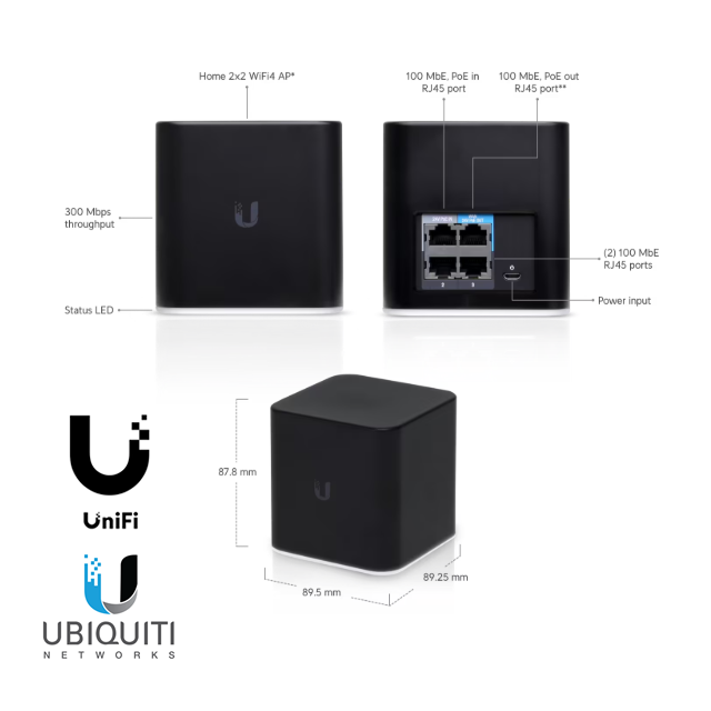 Access Point y router Ubiquiti, Unifi, airCube, modelo ACB-ISP, banda 2.4 GHz, 2x2 MIMO, 802.11n (hasta 300 Mbps), 4x 10/100 Mbps, antena 4 dBi. Aliment: PoE 24V o USB 5V/2A. Precio no incluye IVA.
