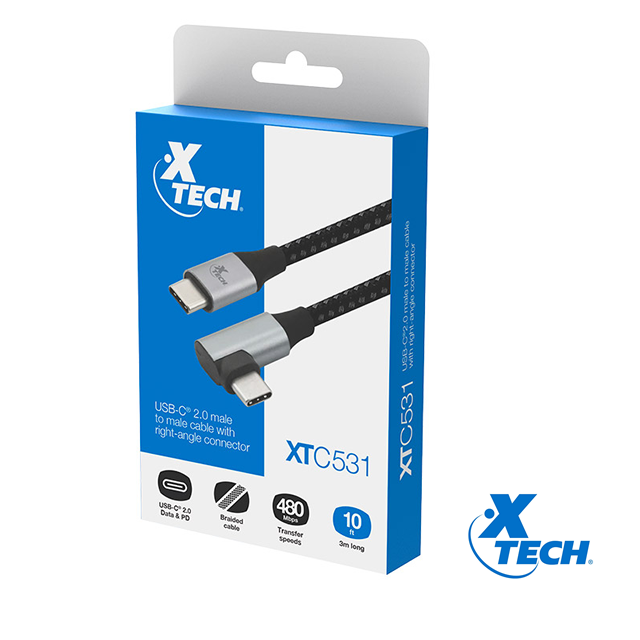 Cable Xtech, XTC-531, USB-C (M) a USB (M), conector en forma L (ángulo recto), longitud 3 metros, para transferir datos (hasta 480 Mbps) y carga (PD). Garantía 1 año. Precio no incluye IVA.
