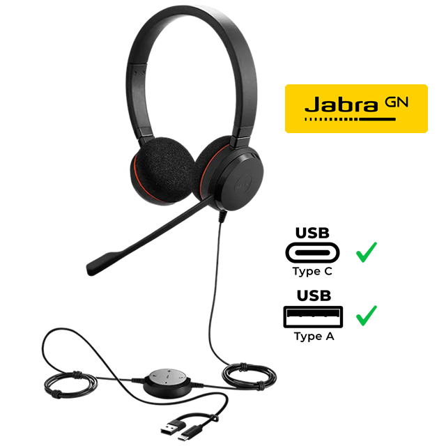 Jabra, Evolve 20 Stereo, Unified Communication Certified, USB-C/USB-A, Plug and Play, para computadoras y dispositivos móviles, gestión de llamadas. Garantía 1 año. Precio no incluye IVA.